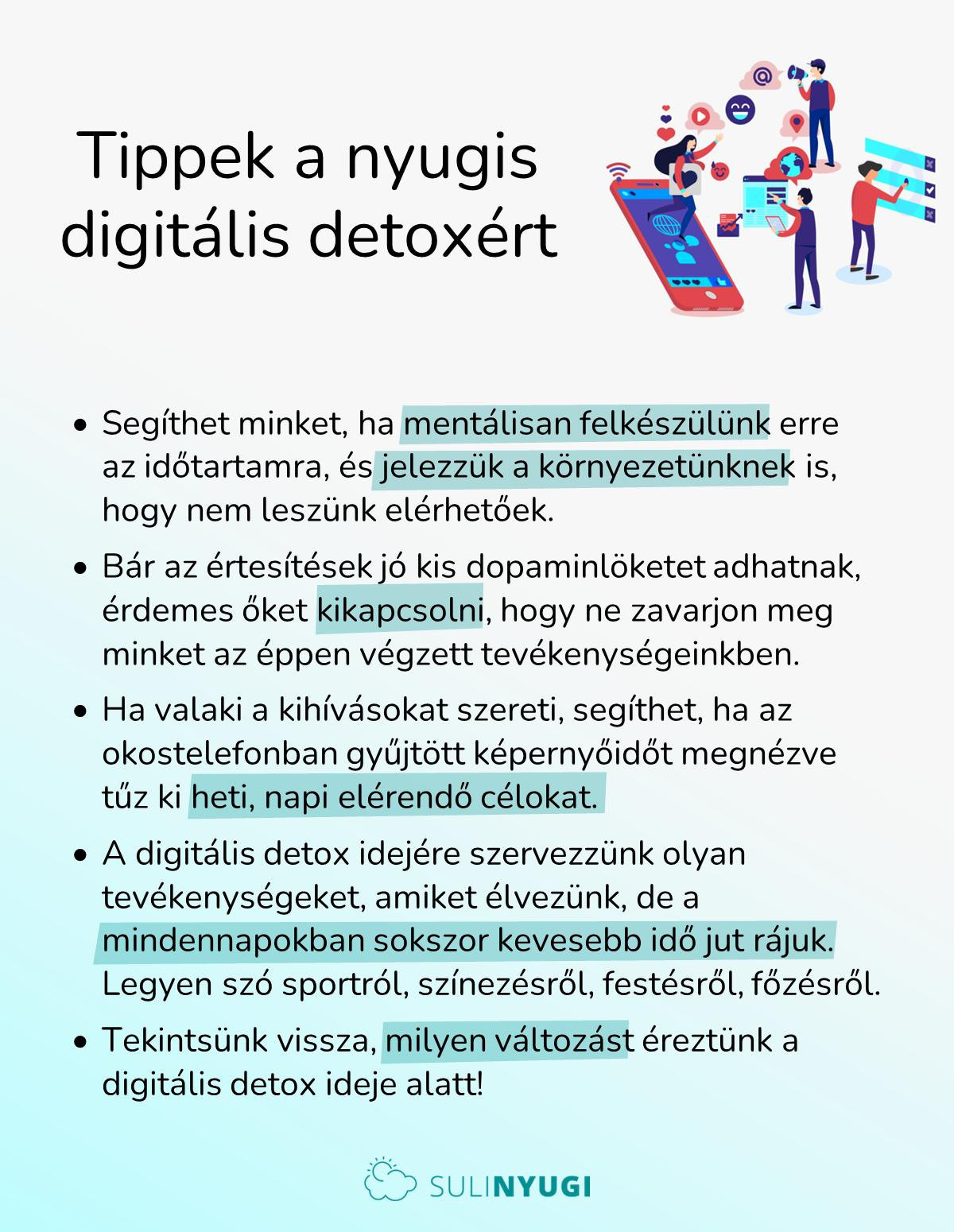Mikor volt utoljára, hogy egész nap nem nyitottuk meg a közösségi média oldalakat? Meddig „bírjuk” anélkül, hogy felkapnánk a telefonunkat? Milyen olyan helyzetek vannak, amikor nincs karnyújtásnyira a telefonunk? A válaszaink alapján lehet elgondolkodunk, hogy érdemes lehet határokat szabni az eszközhasználatnak. Nem véletlenül lett egy külön kifejezés a digitális detox.