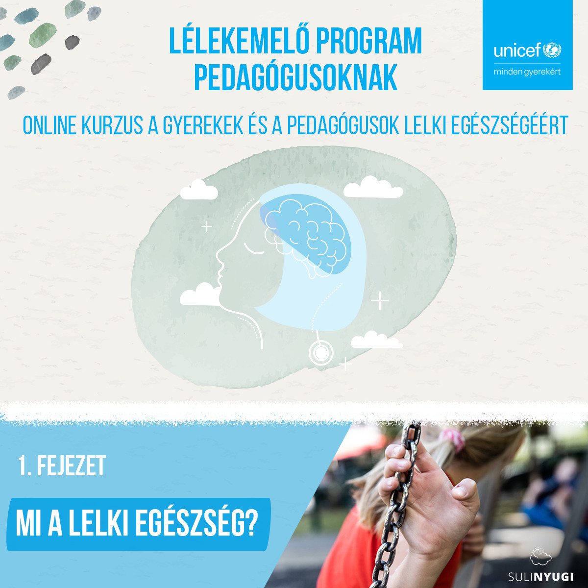 Az UNICEF Magyarország 5 részes online kurzusa a Sulinyugi együttműködésével azért készült, hogy segítsen a pedagógusoknak felismerni és lehetőség szerint meg is előzni a gondjaikra bízott diákok komolyabb mentális problémáit, ugyanakkor megőrizni, adott esetben helyreállítani saját lelki egészségét.